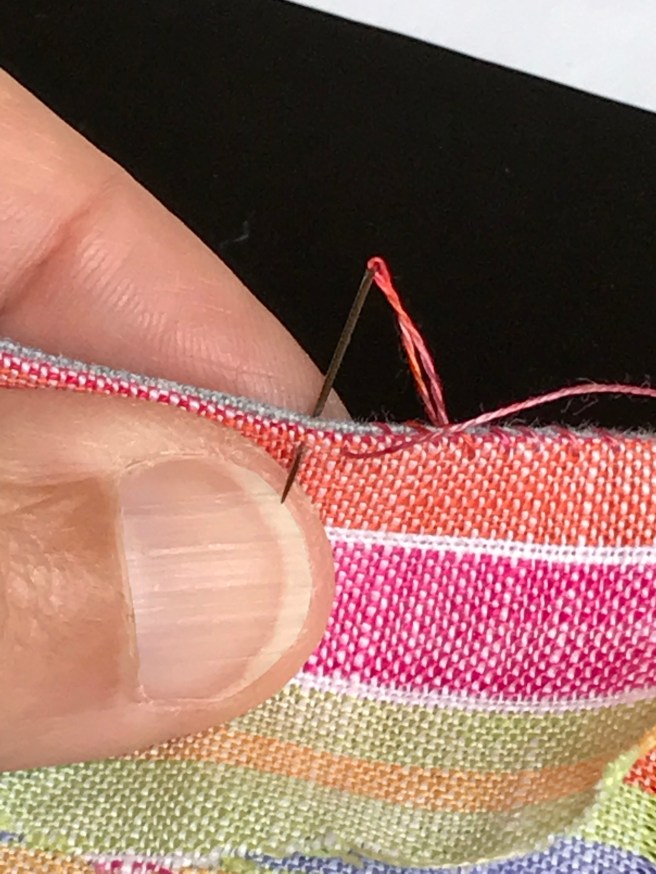 Dyed thread by Deb LacativaAfter stitching the words (and I’m feeling a bit rusty as it’s been a while), I pieced the two patches together with an overcast seam …