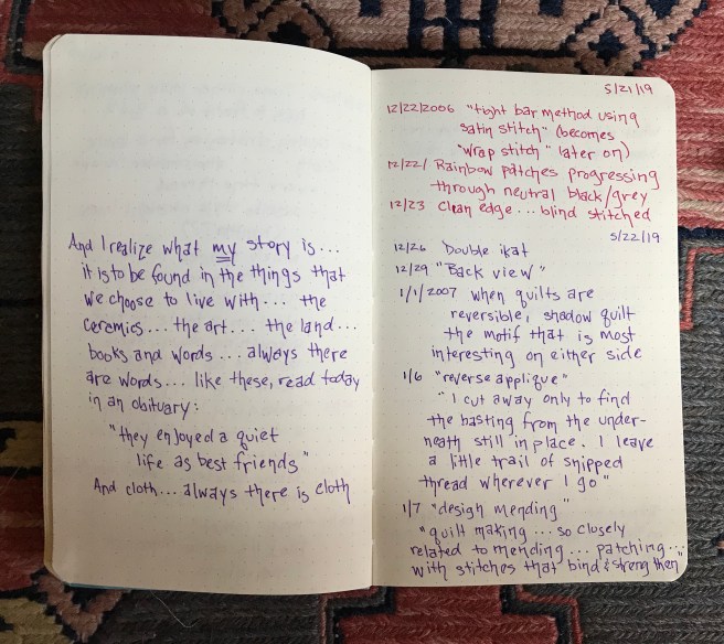 Many of the patches hold words and I realized how much they are a part of my way. So I went to my boxes of cloth looking for these scraps of my mom’s shirt …