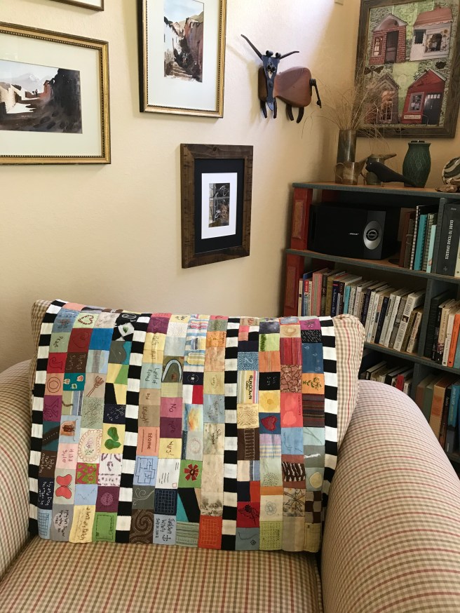 My all-time favorite cloth (to date) is Remember 2016, with a patch for each day of the year I turned 60. It currently lives on the back of a chair where I can see it every day …
