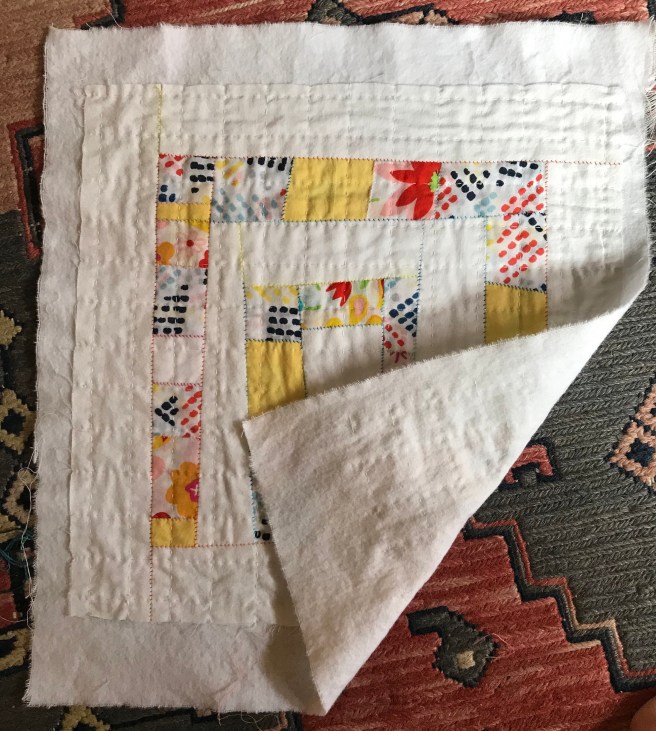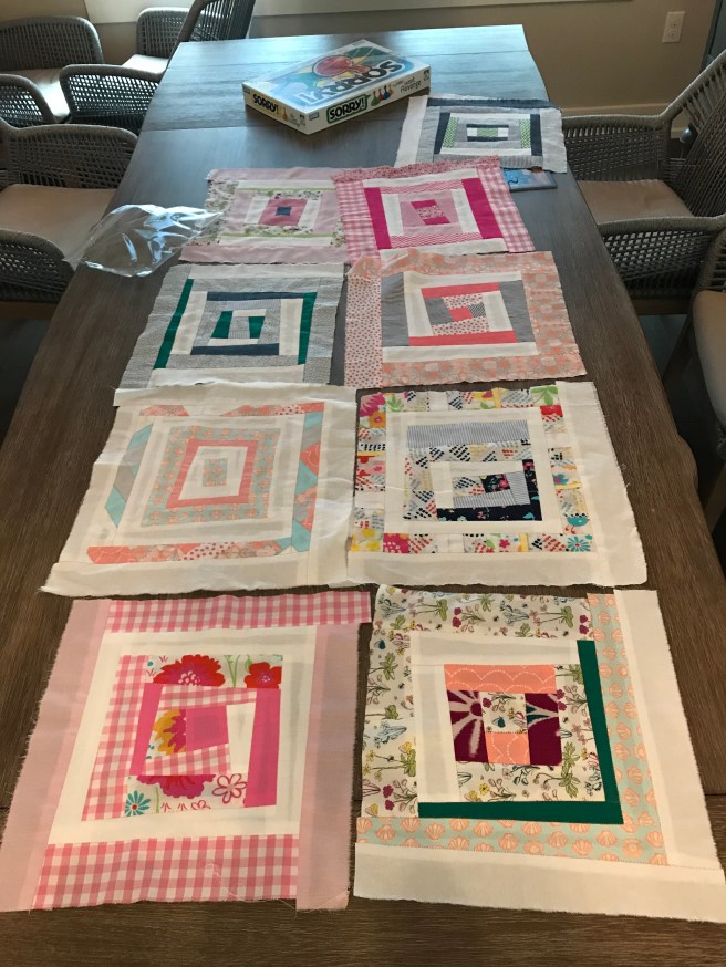 So, I’m backing up here for some, uh, backstory. As I began to work on P’s patchwork coverlet, I created 11 wonky log cabin blocks with her outgrown baby clothes. Then I asked Meg (her mom), to choose eight of the blocks and arrange them to her liking …