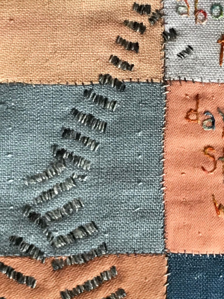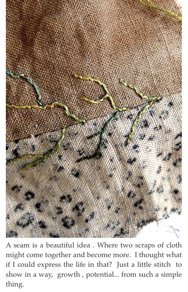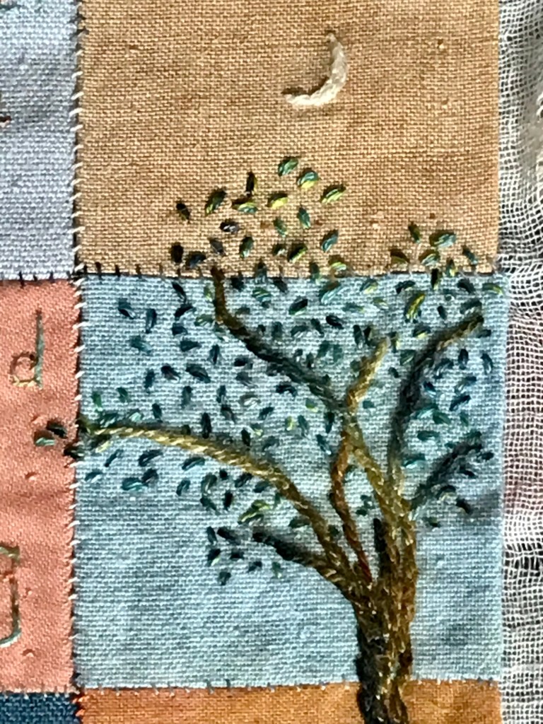 Originally I had thought to add to the Wendell Berry quote on this bit of cloth, filling the columns to the left and the right with words. But I ended up creating a stitched impression instead, of a tree and fire escapes like those that so often appeared in Michelle Slater’s blog