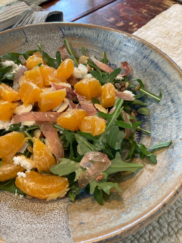 Arugula, mixed grains (wheat & rye berries, red rice, kasha and barley), fresh mandarin oranges (with thanks to Don for peeling them), toasted almonds, crumbled queso fresco, and speck (smoked prosciutto) dressed with a light vinaigrette that had just a bit of agave added. So good … thanks Deb!