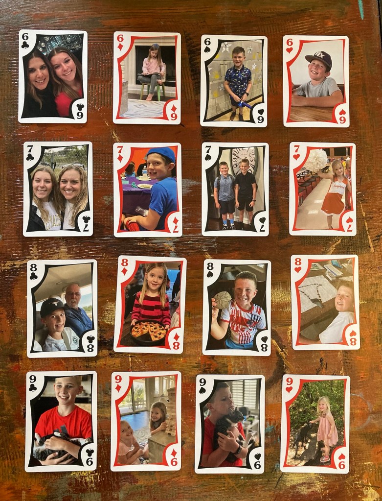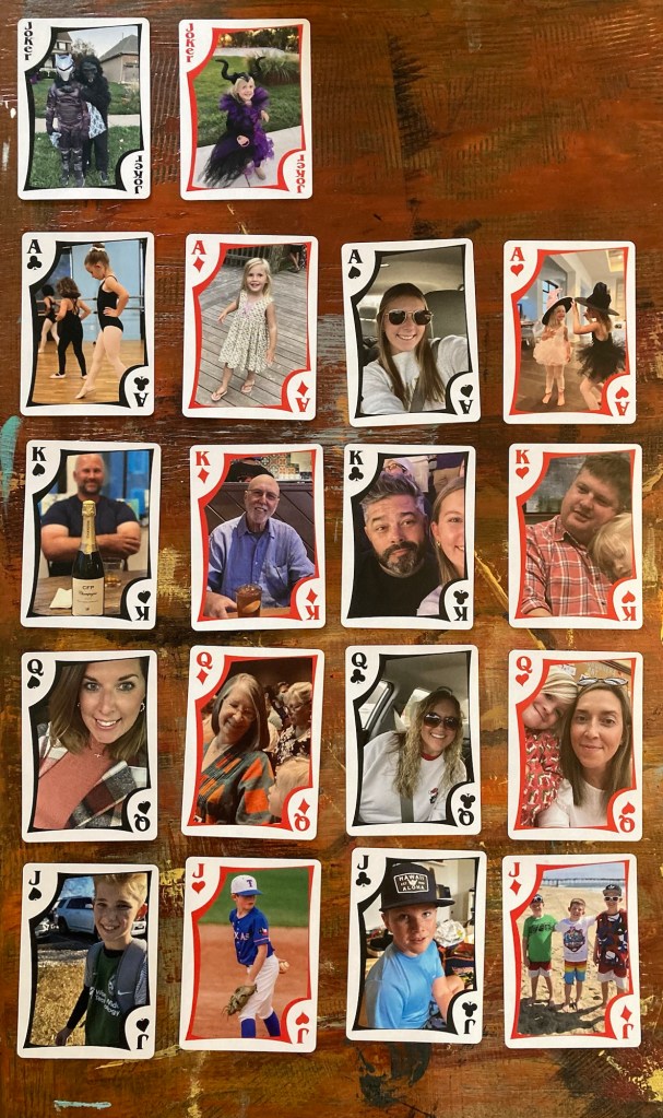 Aces for our granddaughters, Kings for the dads, Queens for the moms, and Jacks for the grandsons, with a couple of Halloween shots for the Jokers …