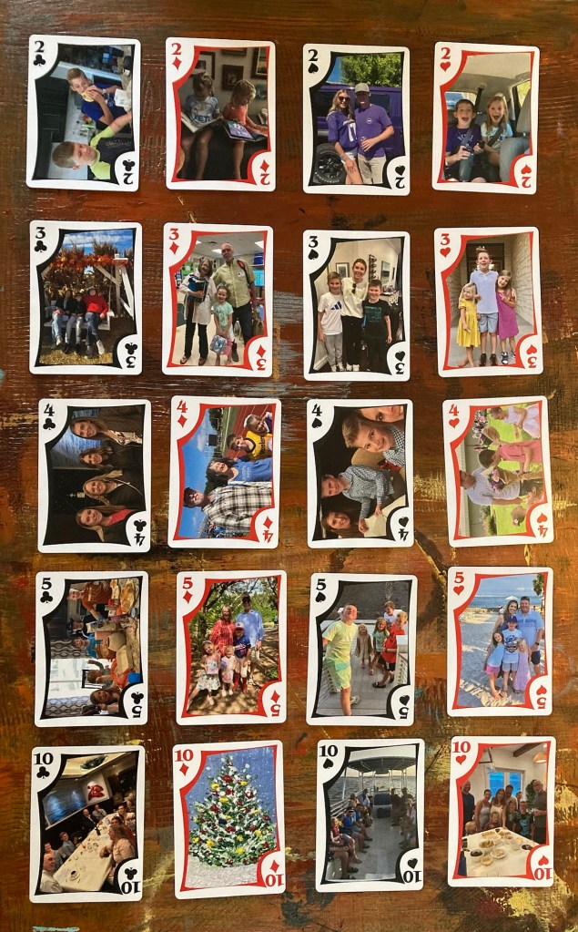 I used one of Don’s recent paintings for the card backs and asked my family to send me some of their favorite 2023 pictures. As they have in the past, makeplayingcards.com made the rest of the job easy.