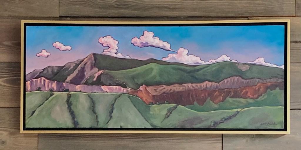 I actually made two blocks inspired by Debbie Carroll’s First Light, which we bought in the summer of 2020 after receiving the Covid stimulus money from the federal government (being retired on pensions, we didn’t need need the money, so we thought investing in a local art gallery was a good way to get it back in circulation) …