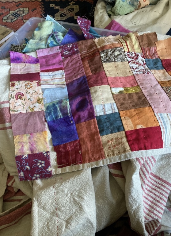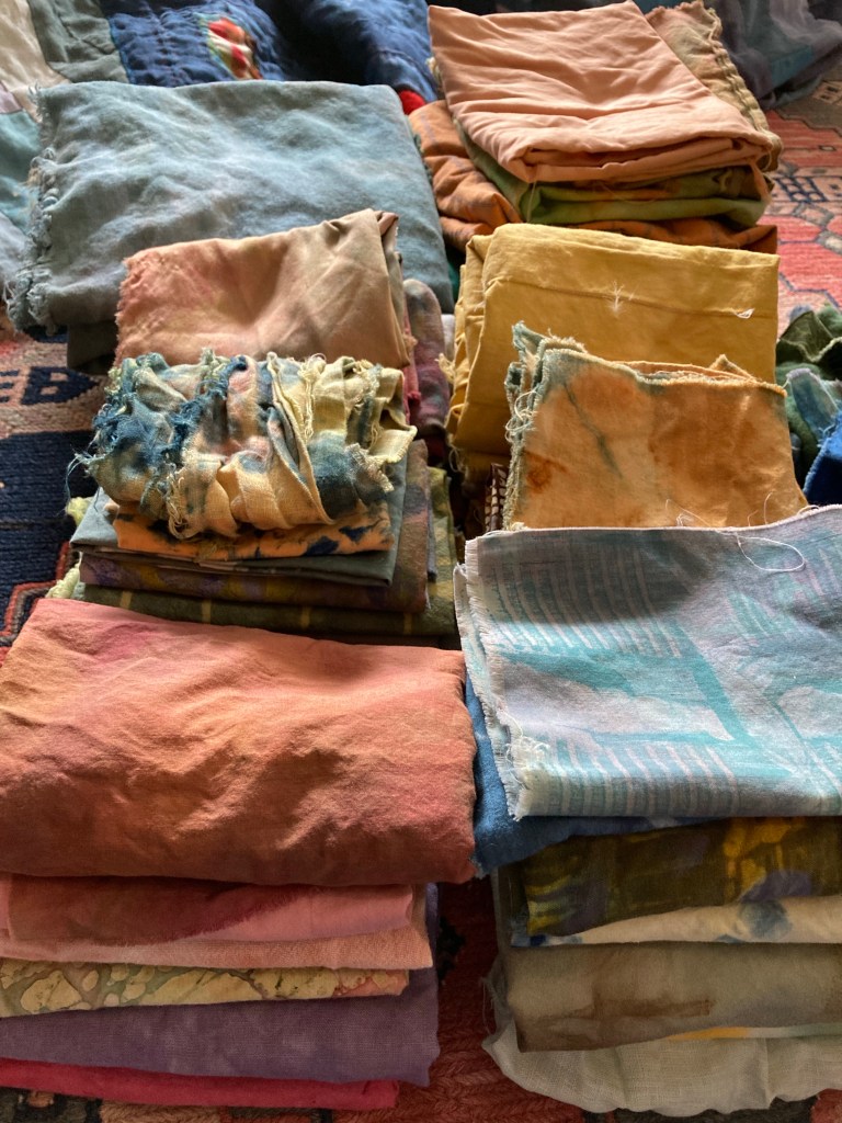 In any case, we were there to receive gifts of rust for Don’s assemblages and cloth for my patchplays. Connie was an intrepid dyer, so it was hard to choose, but here’s the first grouping to be used …